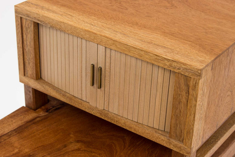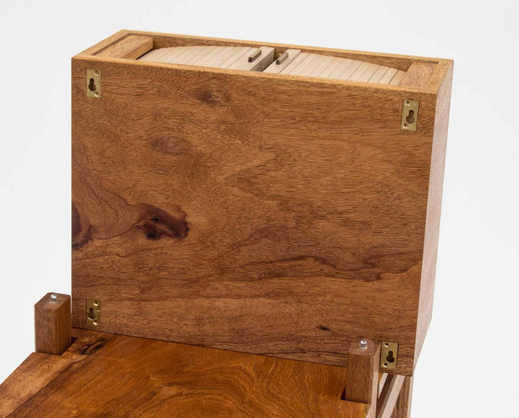 Two-tier end tables are unique pieces of furniture because of their dynamic shape and added functionality. While at the Krenov School of Fine Woodworking, I explored this concept. Tambour doors were selected as a way to add storage but avoid any stored objects being visible and any interference with the first level. When opened, the tambour doors disappear into the box (plus they are fun to play with). This furniture piece was designed to fit between two lounge swivel chairs in a small nook.